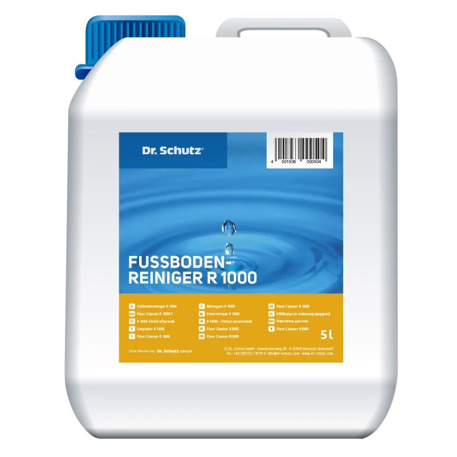 Dr. Schutz® R 1000 Fußbodenreiniger (1 Liter reicht für 1000 m²) ist ein wasserbasiertes Wischpflegemittel für die Reinigung und Pflege aller elastischen Böden wie PVC, Linoleum und Vinyl. Beim Reinigen erzeugt der R 1000 Reiniger einen wasserlöslichen Pflegefilm, der rutschhemmend, schmutzabweisend und antistatisch wirkt. Der Bodenreiniger erfüllt die Anforderungen nach DIN 18032 für Sportböden; darüber hinaus ist es polierfähig und zur Verwendung in Reinigungsautomaten geeignet, kann also manuell wie maschinell verarbeitet werden. Das Universalprodukt ist sowohl für die Ersteinpflege wie auch zum regelmäßigen Reinigen von Linoleum, PVC und Vinyl-Böden bestens geeignet.