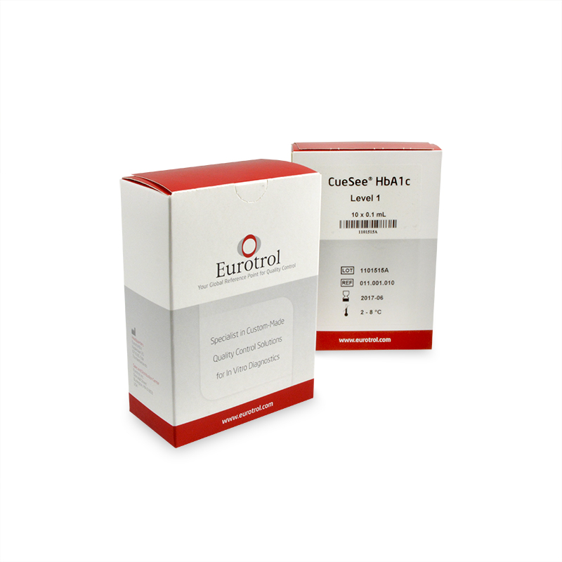 Die Eurotrol CueSee® HbA1c Level 1 ist eine Kontrolle für glykiertes Hämoglobin und dient der Überprüfung von Genauigkeit und Präzision von HbA1c Systemen. Der Zweck dieser Qualitätskontrolle ist die Prüfung der Kalibration und anderer Leistungsmerkmale. CueSee® HbA1c erfüllt die Europäische IVD Richtlinie 98/79/EG und tägt das CE-Zeichen. CueSee® HbA1c Qualitätskontrollmaterial ist verfügbar in 3 verschiedenen Konzentrationsbereichen (Level 1 (niedrig), Level 2 (normal) und Level 3 (hoch)). Eurotrol HbA1c Control wird aus hämolysiertem und lyophilisiertem Humanblut hergestellt. Der Matrix sind Stabilisatoren und Protektoren (Kryo/Lyo Protektoren) zugesetzt. CueSee® HbA1c dient der regelmäßigen Überprüfung von Präzision und Genauigkeit von HbA1c Systemen. CueSee® HbA1c soll ungeöffnet bei einer Temperatur von 2-8 °C im Kühlschrank gelagert werden. Unter diesen Bedingungen ist die Flasche bis zu dem auf der Verpackung angegebenen Verfallsdatum haltbar. Nach Öffnen der Flasche und Rekonstitution des Materials, ist die Kontrolle 48 Stunden bei 2-8 °C in der geschlossenen Flasche haltbar.
