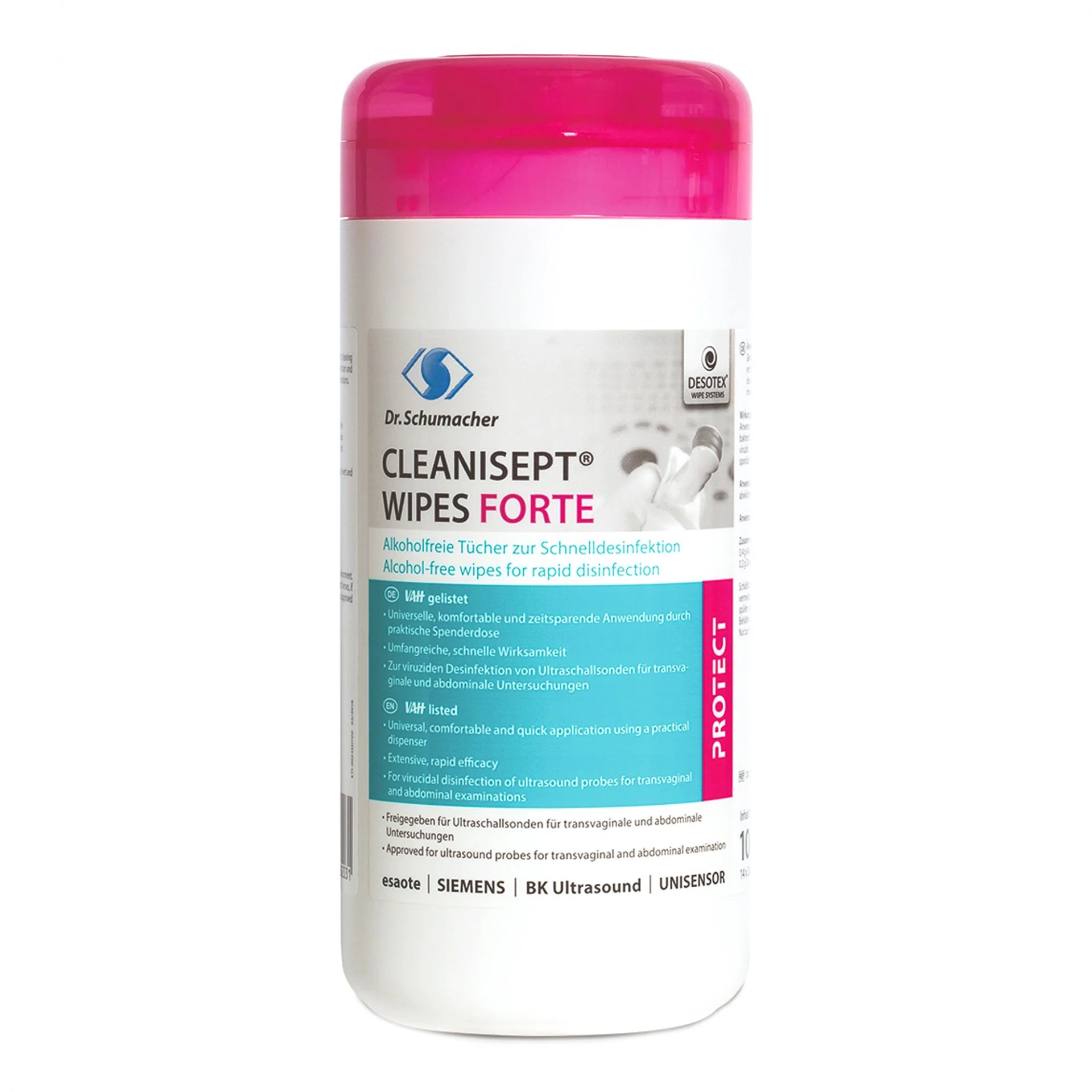 Dr. Schumacher Cleanisept Wipes forte sind gebrauchsfertige, alkoholfreie Tücher zur Reinigung und viruziden Desinfektion von Ultraschallsonden für transvaginale Untersuchungen. Die Einmaltücher sind aus der praktischen Spenderdose einzeln entnehmbar und schnell einsatzbereit.