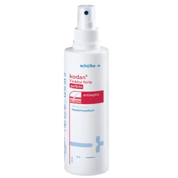 Die kodan Tinktur forte ist eine gebrauchsfertige Lösung auf alkoholischer Basis zur Desinfektion der Haut. Im Einsatz kommt die kodan Tinktur forte zur Hautdesinfektion vor operativen Eingriffen, Blutentnahmen, Injektionen, Punktionen, Biopsien und Wund- bzw. Nahtversorgung. Breites antiseptisches Wirkungsspektrum (bakterizid inkl. Mykobakterien und MRSA, fungizid, begrenzt viruzid inkl. HIV, HBV, HCV, HSV, Adenovirus Typ 5 und Rotavirus). Jederzeit einsatzbereit, da gebrauchsfertig. Das Hautantiseptikum ist wahlweise farblos oder gefärbt lieferbar.