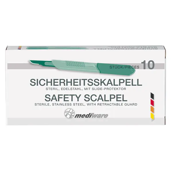 Mediware Einmal-Sicherheitsskalpelle, einzeln steril verpackt, Edelstahlklinge, im Blister verpackt.